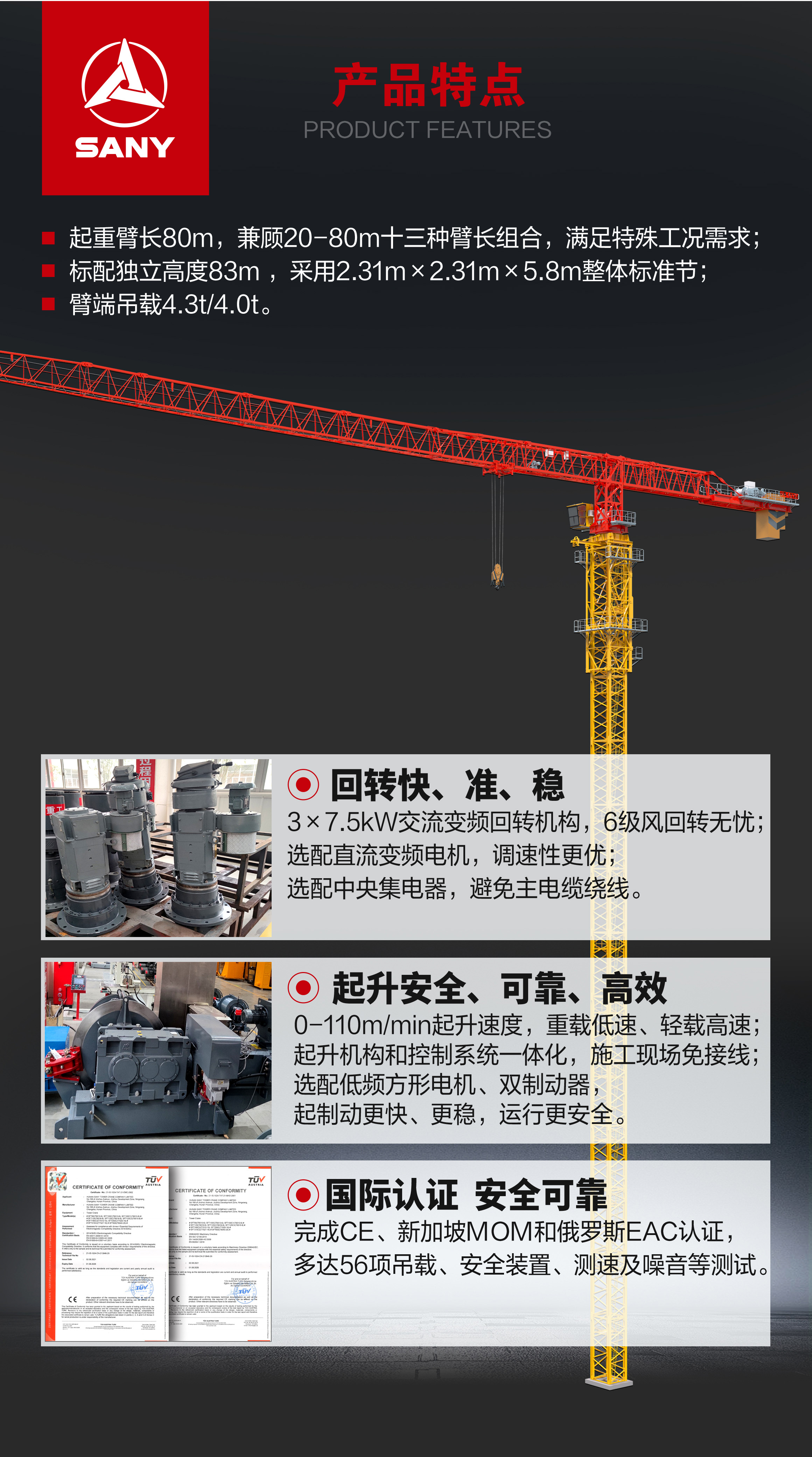 完成CE、新加坡MOM和俄罗斯EAC认证,多达56项吊载、安全装置、测速及噪音等测试
