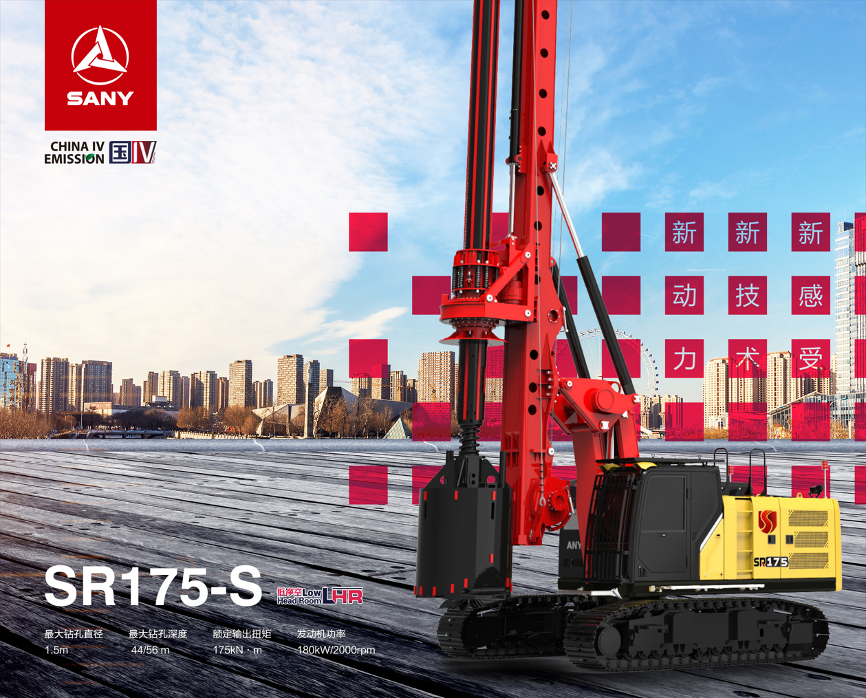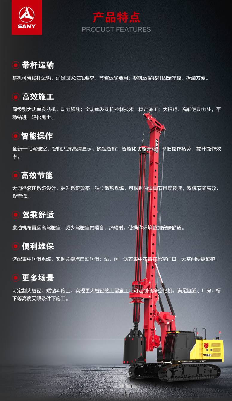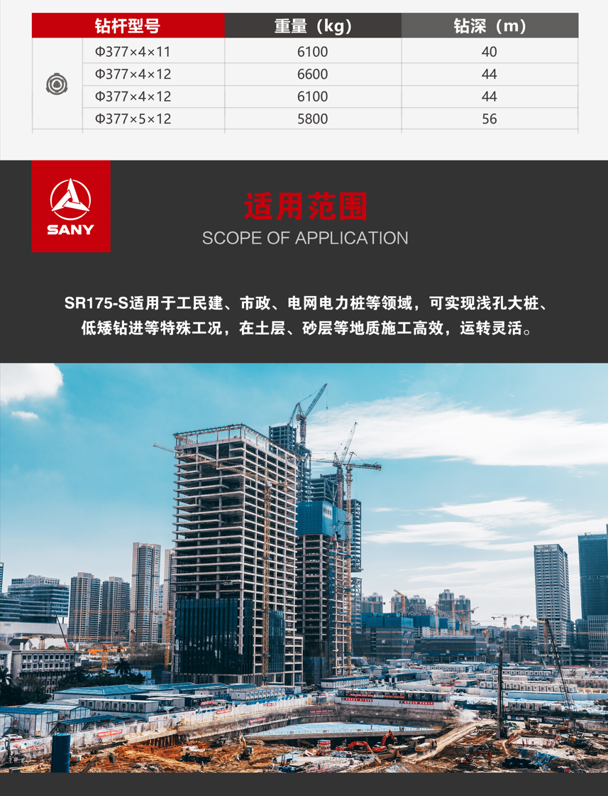 SR175-S适用于工民建、市政、电网电力桩等领域,可实现浅孔大桩、低矮钻进等特殊工况,在土层、砂层等地质 施工高效,运转灵活。