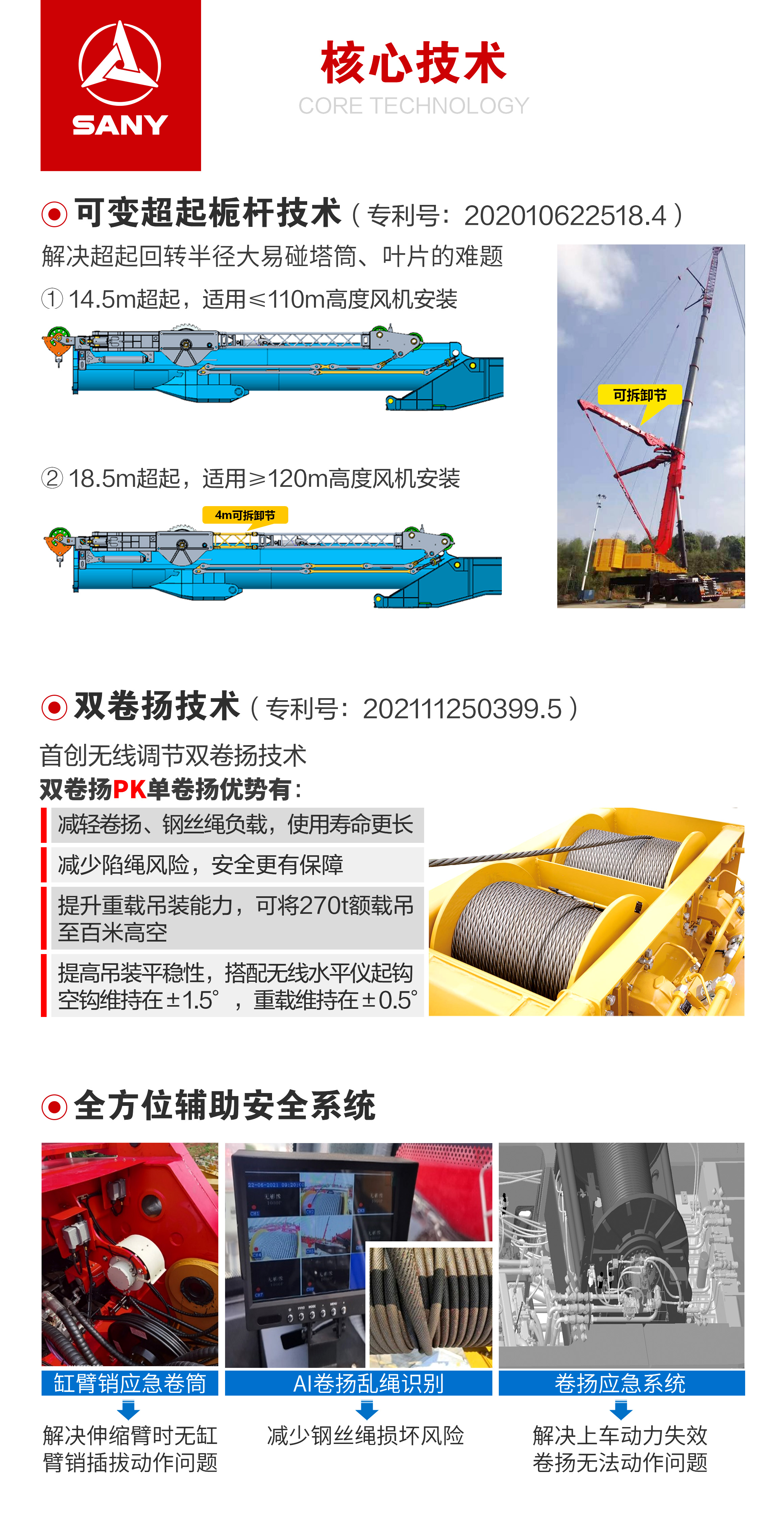可将270载吊至百米高空;无线调节双卷扬技术,风机检修不限绳;无线水平仪重载起钩±0.5°,吊装更精准。