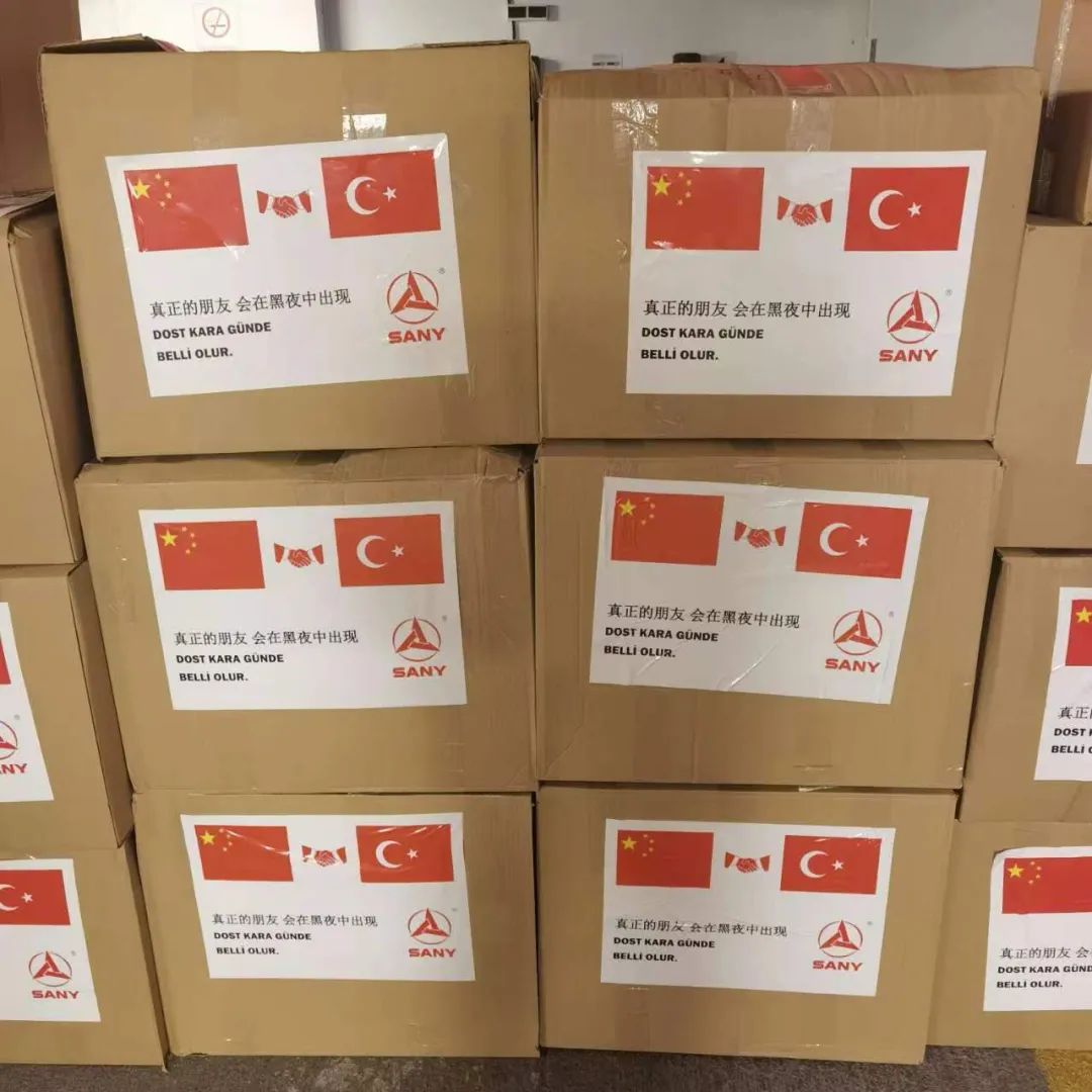 在三一捐赠给当地的物资包装箱上,印有一句土耳其谚语:“Dost kara günde belli olur真正的朋友会在黑夜中出现”。作为一家国际化的中国企业,三一集团万里驰援只为生命至上,于患难处伸援手、现真情,携手共筑人类命运共同体!