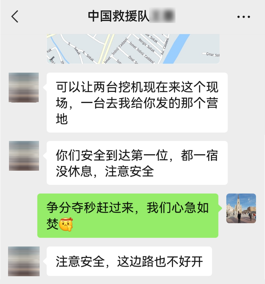奔赴灾区的路上余震不断,堵车不断。在收到中国救援队提出的设备支持请求后,三一救援队队长李彬回复道:“争分夺秒赶过来,我们心急如焚。”自2月6日地震发生后,他和三一同事们一直揪着心在赶路,基本顾不上睡觉。
