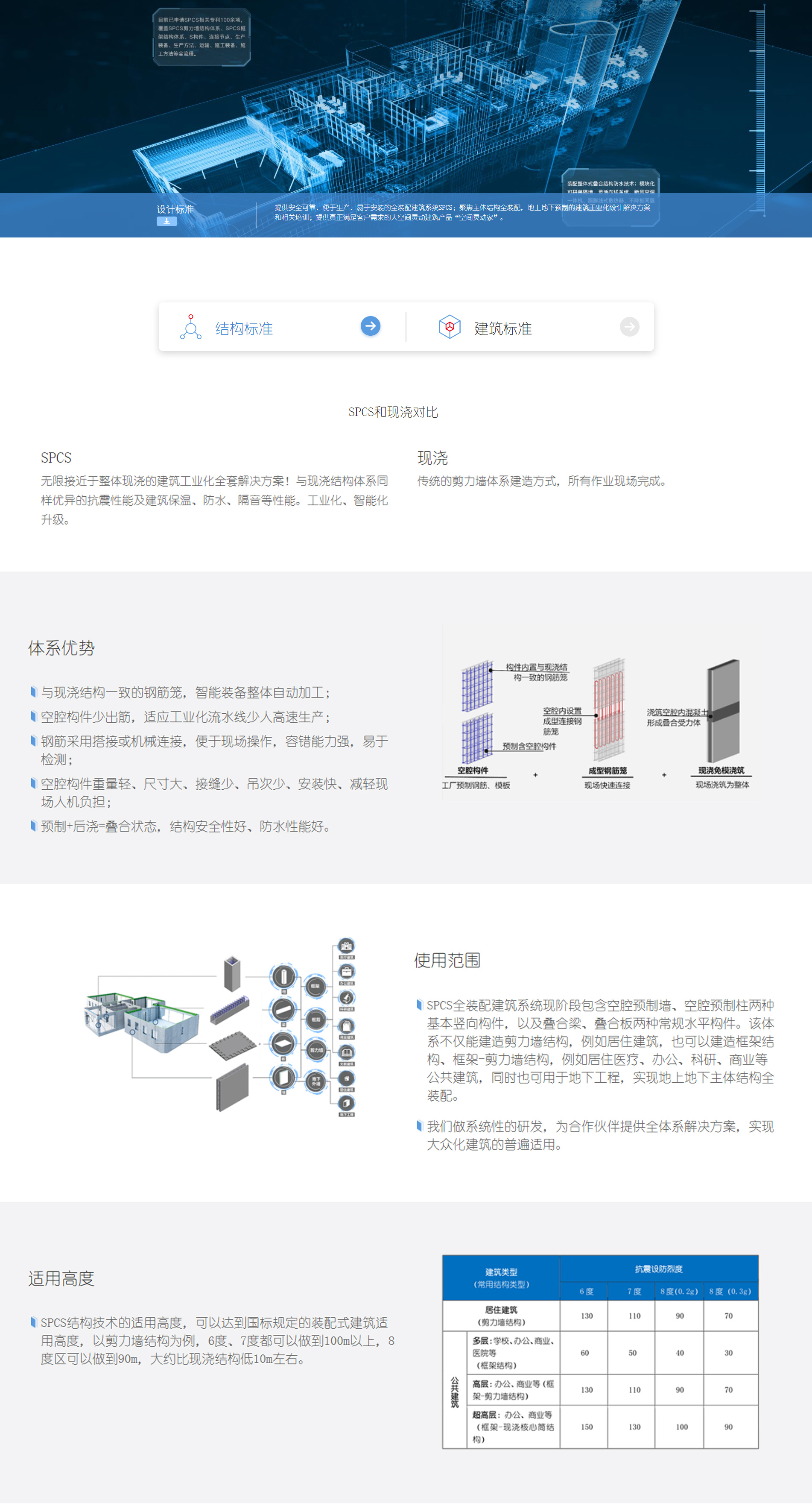 提供安全可靠的建筑工业化系统解决方案SPCS,基于“空腔墙柱+等效异构”的技术实现“地上地下全装配”的总体目标。