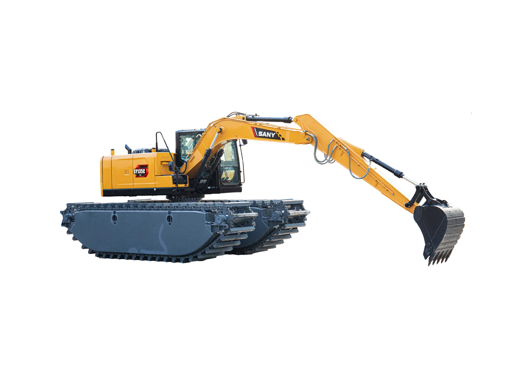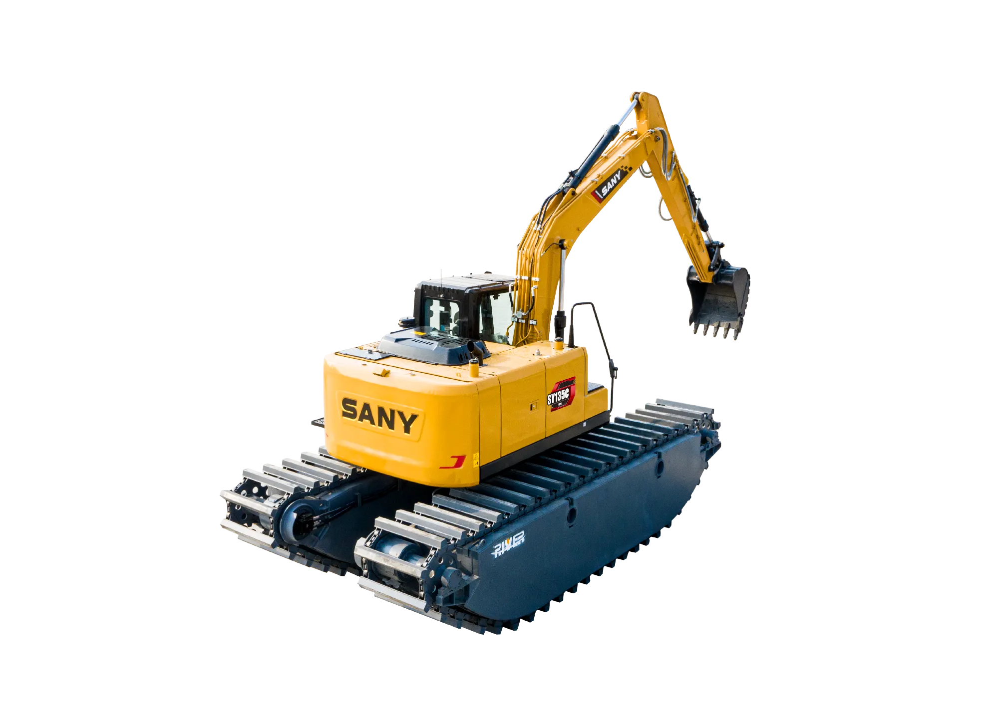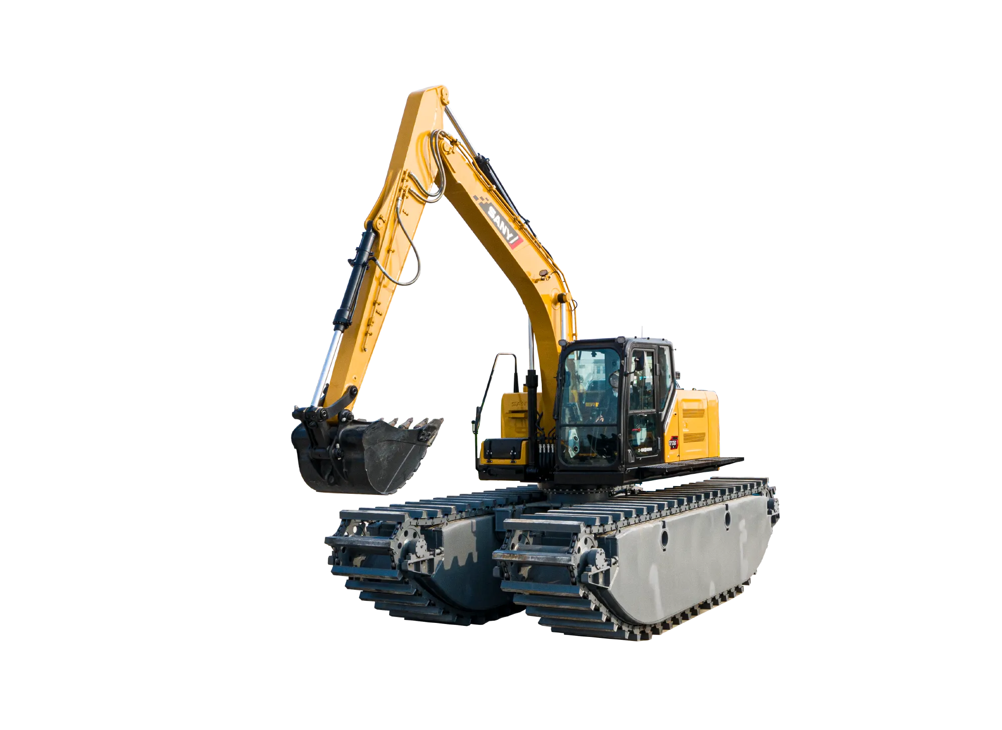 SY155ME船挖是一款水陆两栖特种设备,依靠其独特的船式浮箱结构能够保证整机在水中的正常作业和安全浮航。多适应于陆地、沼泽地、湿地和浅水区域进行河道清淤、环境整治、水域治理及江、河、湖、海、滩涂的资源开发等作业,通过更换不同的属具,如破碎锤、振动锤、夹木器等满足不同作业需求,在城市建设、河道疏通和水产养殖业中得到广泛应用。