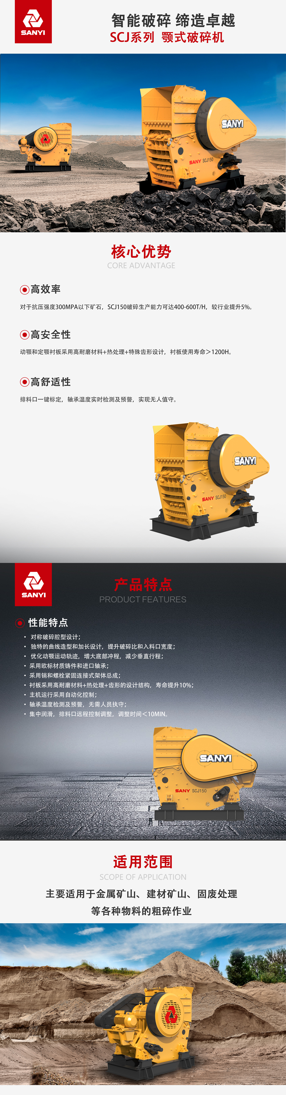 产量达:对于抗压强度300MPa以下矿石,SCJ150破碎生产能力可达400-600t/h,较行业提升5%。
