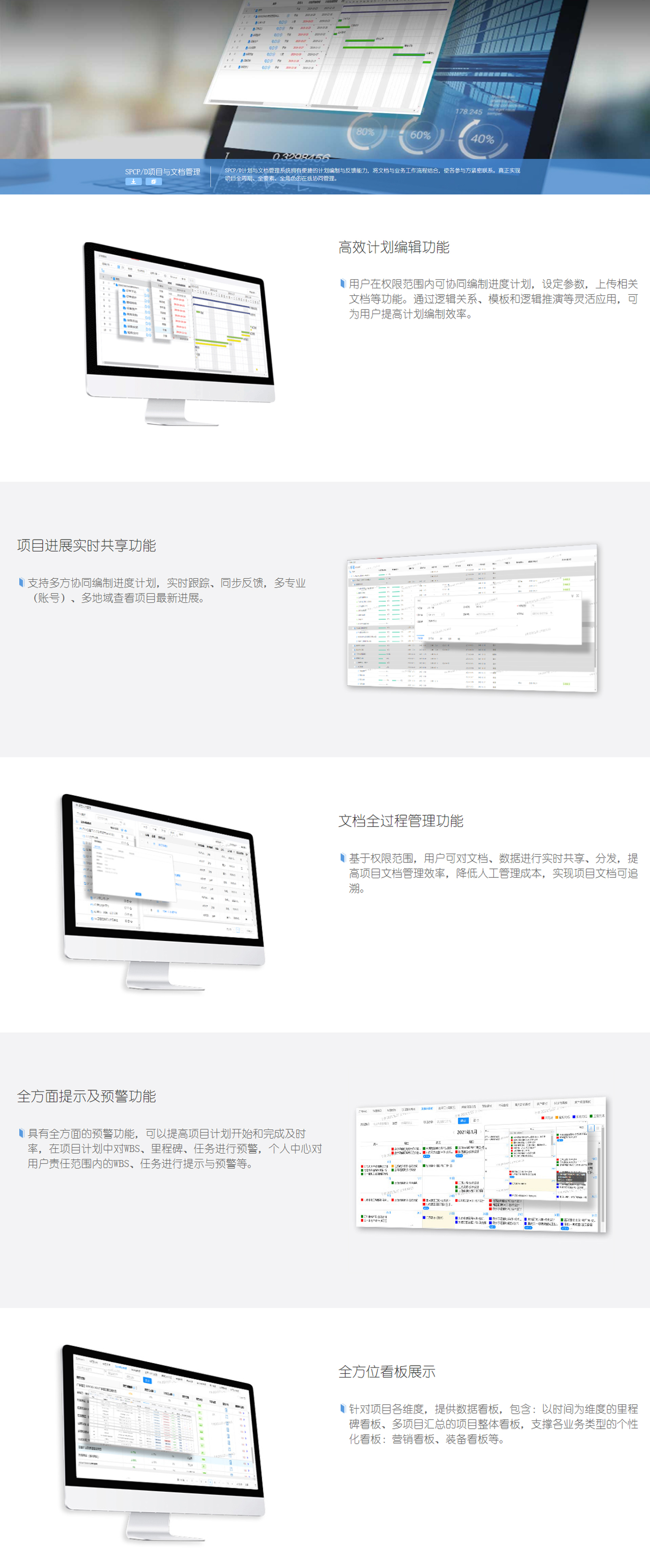 具有全方面的预警功能,可以提高项目计划开始和完成及时率,在项目计划中对WBS、里程碑、任务进行预警,个人中心对用户责任范围内的WBS、任务进行提示与预警等。
