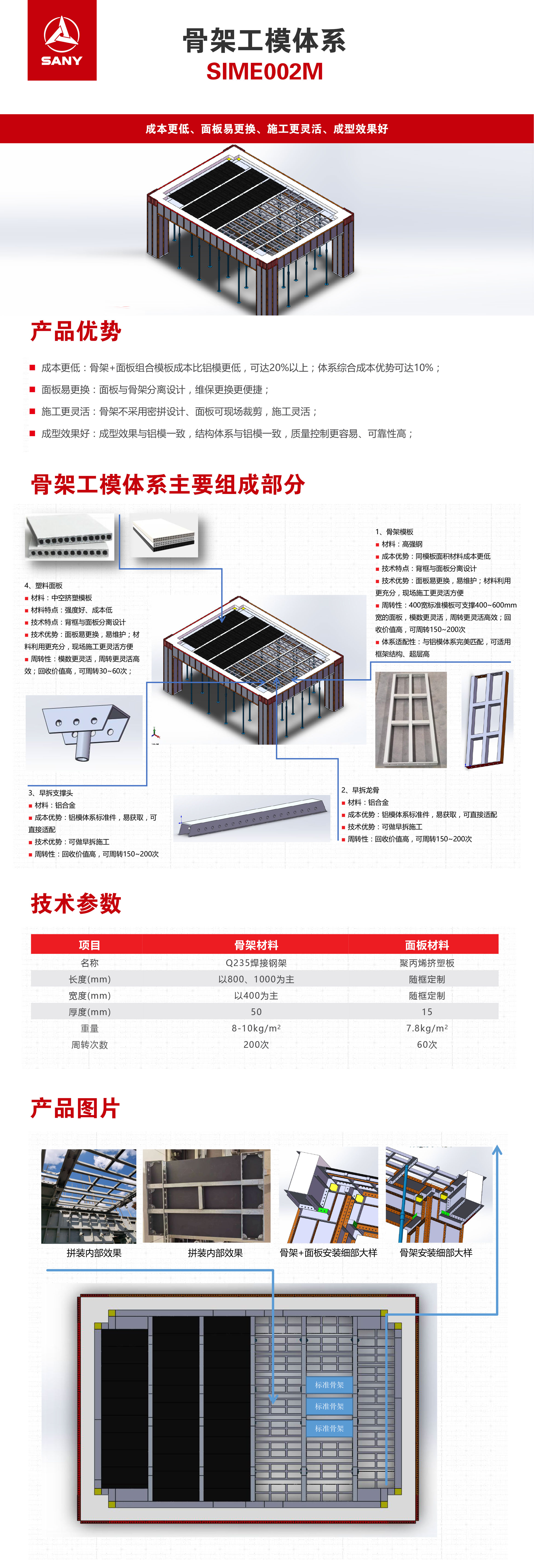 成本更低:骨架+面板组合模板成本比铝模更低,可达20%以上;体系综合成本优势可达10%;