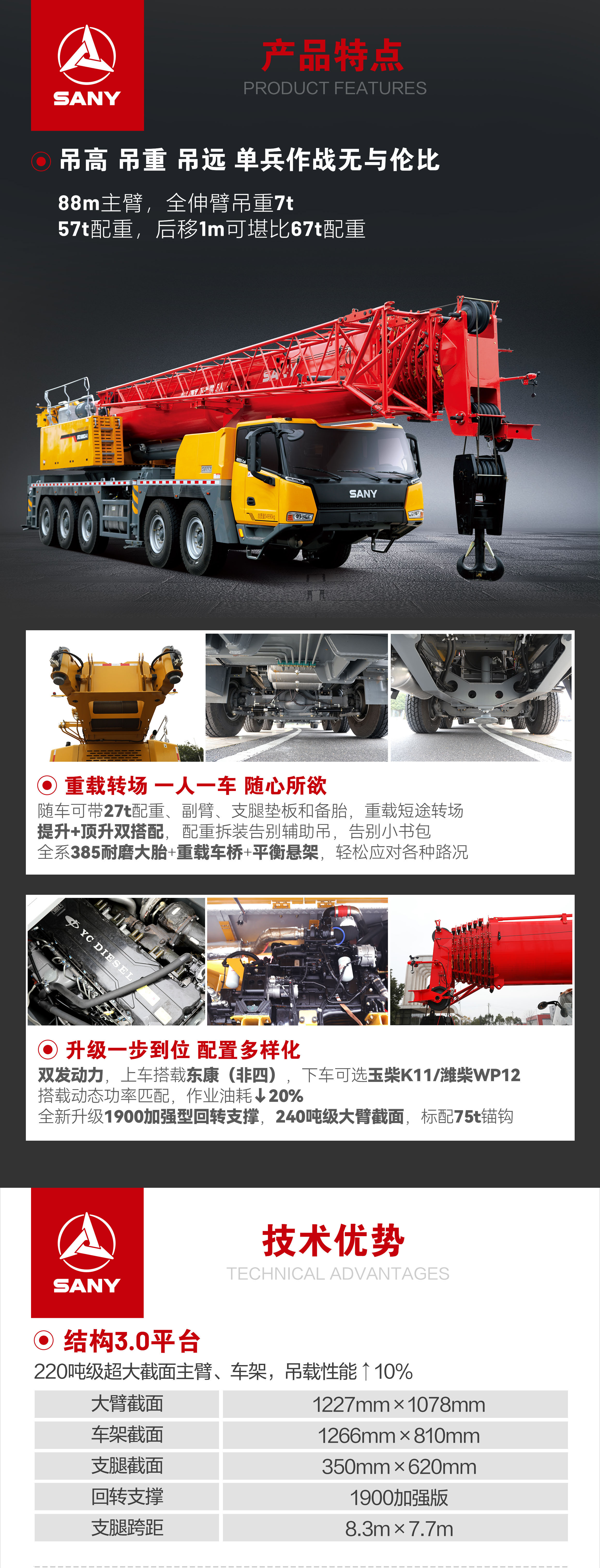 全新升级1900加强型回转支撑,220吨级大臂截面,标配75t锚钩