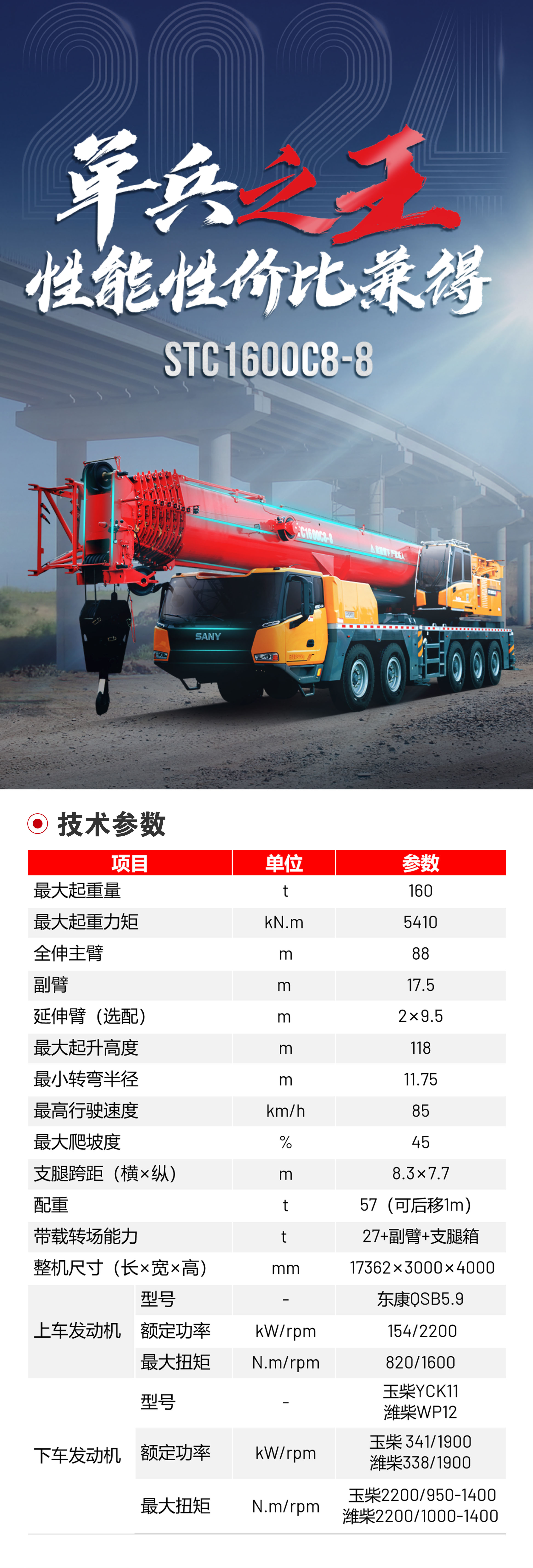 随车可带27t配重、副臂、支腿垫板和备胎,重载短途转场