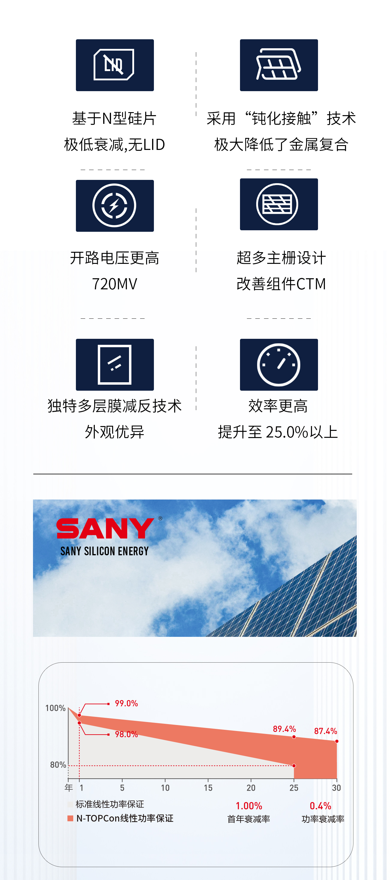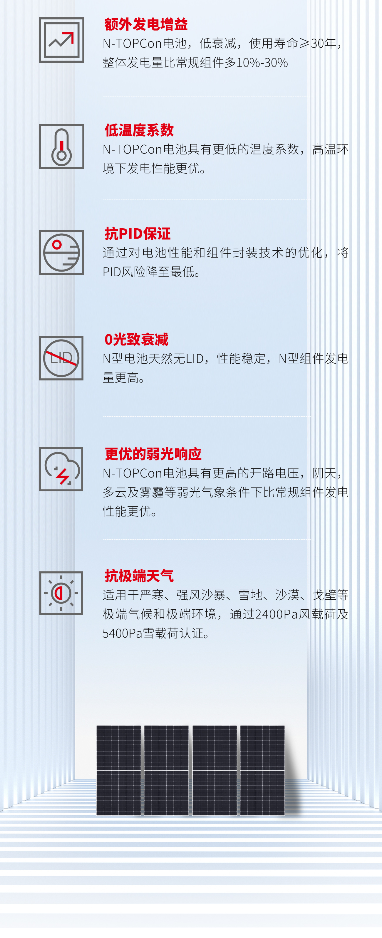 抗PID保证:通过电池和组件封装技术优化将电势诱导引起的衰减(PID)降至最低。