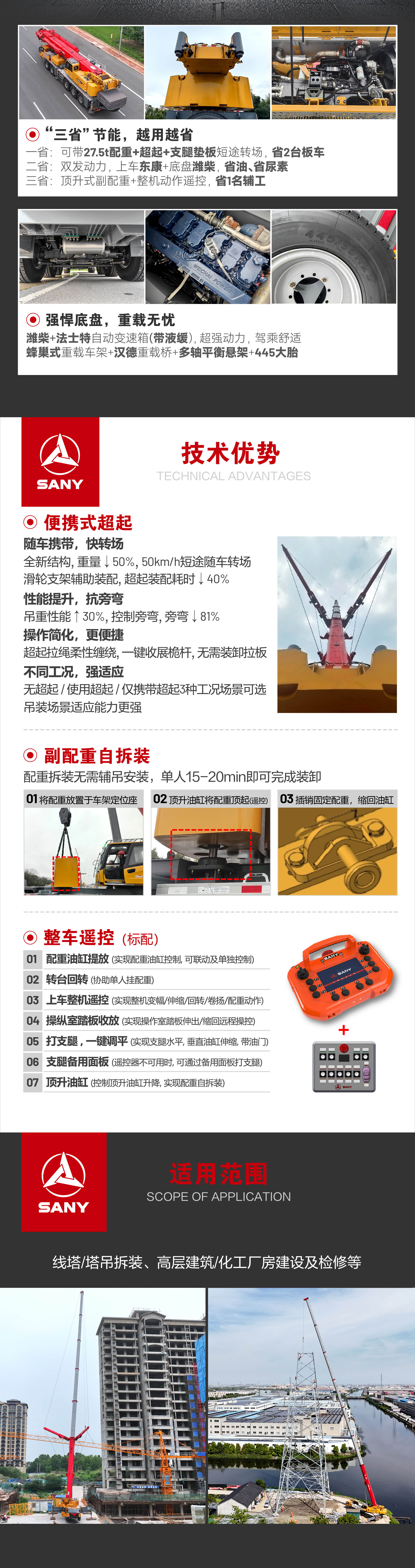 强悍的重载转场能力,可同时携带超起+27.5t配重+垫板单机转场,解决了单机转场带配重就不能带超起的行业痛点,节省一台运输车。