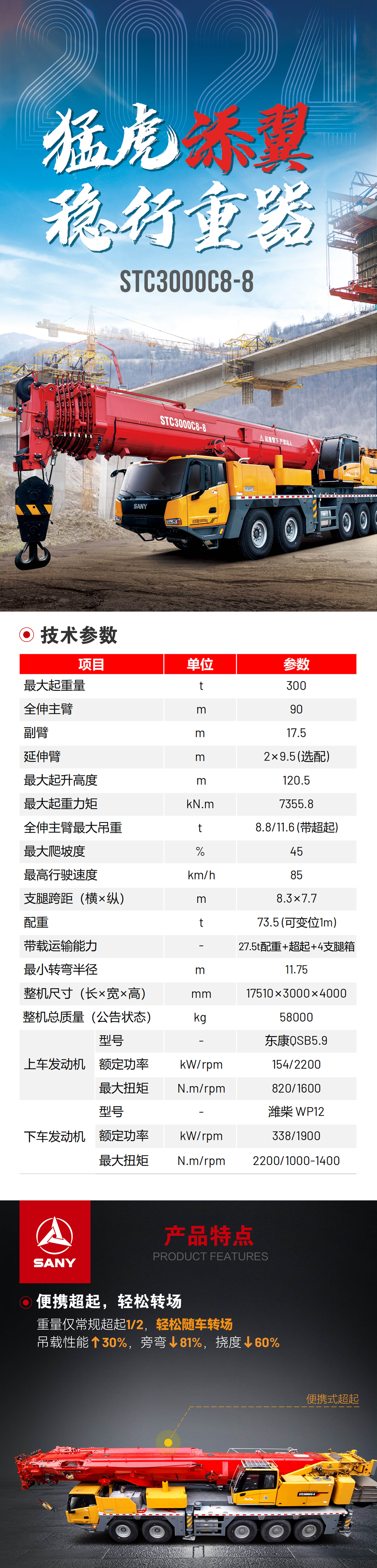 STC3000C8-8——目前三一吨位最大的汽车吊,也是首款可配超起的汽车起重机,为客户在当前租赁行情下提供一种新的运营解决方案,尤其是在城市环境施工。