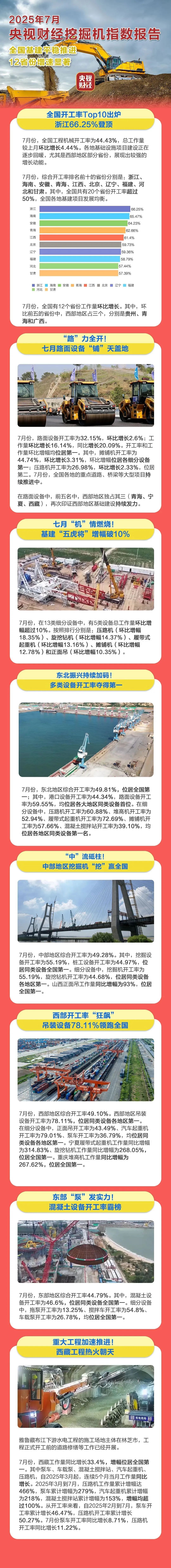 挖掘机是基础设施建设的“标配”,是反映基础设施建设、观察固定资产投资等经济变化的风向标。央视财经与三一重工、树根科技联合打造的“央视财经挖掘机指数”发布了最新相关数据。数据显示,7月份,我国各地基础设施项目建设平稳推进,尤其是西部地区部分省份,展现出较强的增长动能。