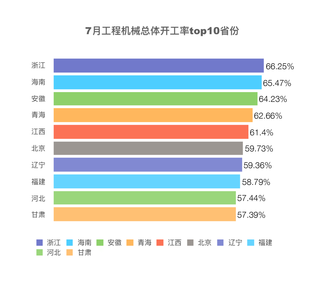 7月份,综合开工率排名前十的省份分别是:浙江、海南、安徽、青海、江西、北京、辽宁、福建、河北和甘肃。其中,全国共有20个省份开工率超过50%,全国各地基建项目发展均衡。