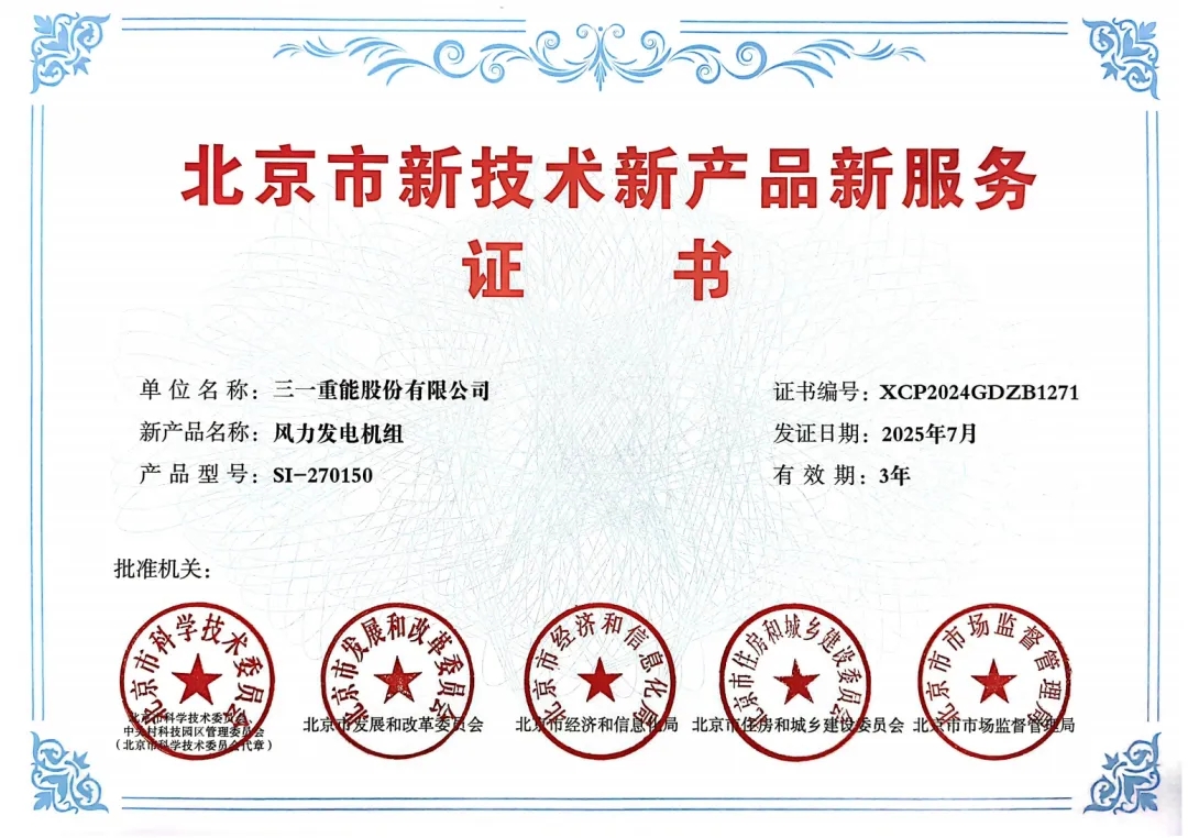 近日,三一重能迎来技术创新成果的"双喜临门"——SI-270150风电机组获得"北京市新技术新产品新服务"认证,SI-264136机型同时摘得"北京市首台(套)重大技术装备产品"认证。