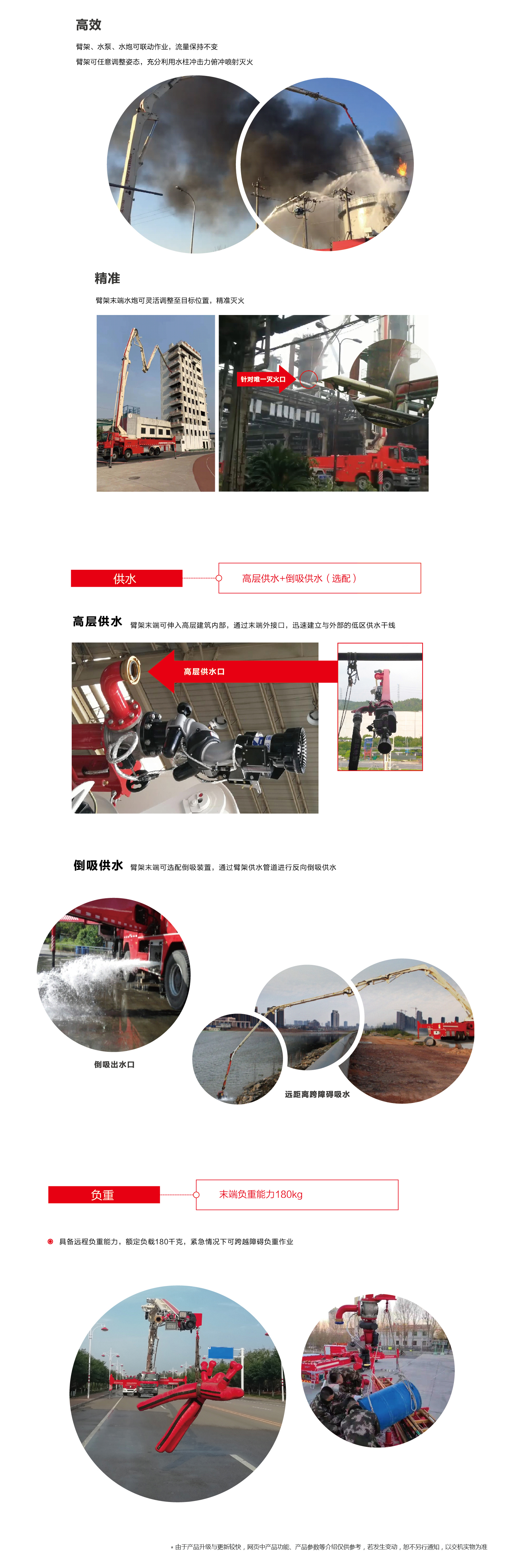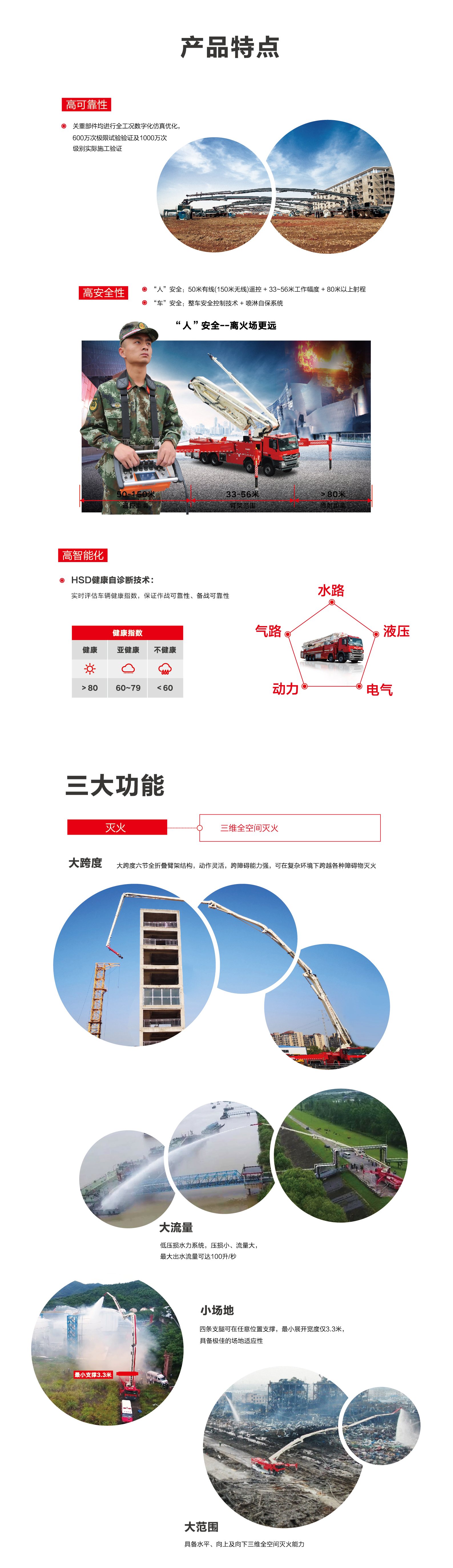 三一大跨度56m举高喷射消防车可有效用于大跨空间建筑(如大型城市综合体、机场高铁候机(车)厅、仓库厂房、文体场馆及石化储罐等)火灾事故处置。整车具备水平跨度大,跨障能力强,精准灭火;任意支撑专利技术,支腿支撑占地小;臂架水炮联动操作;实时火场视频监控;50米有线遥控及150米无线遥控等功能。