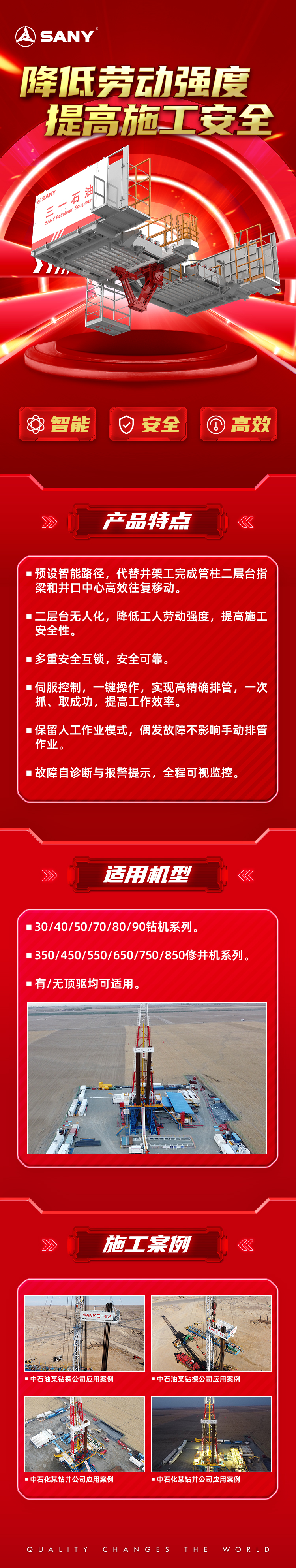 二层台无人化,降低工人劳动强度,提高施工安全性。