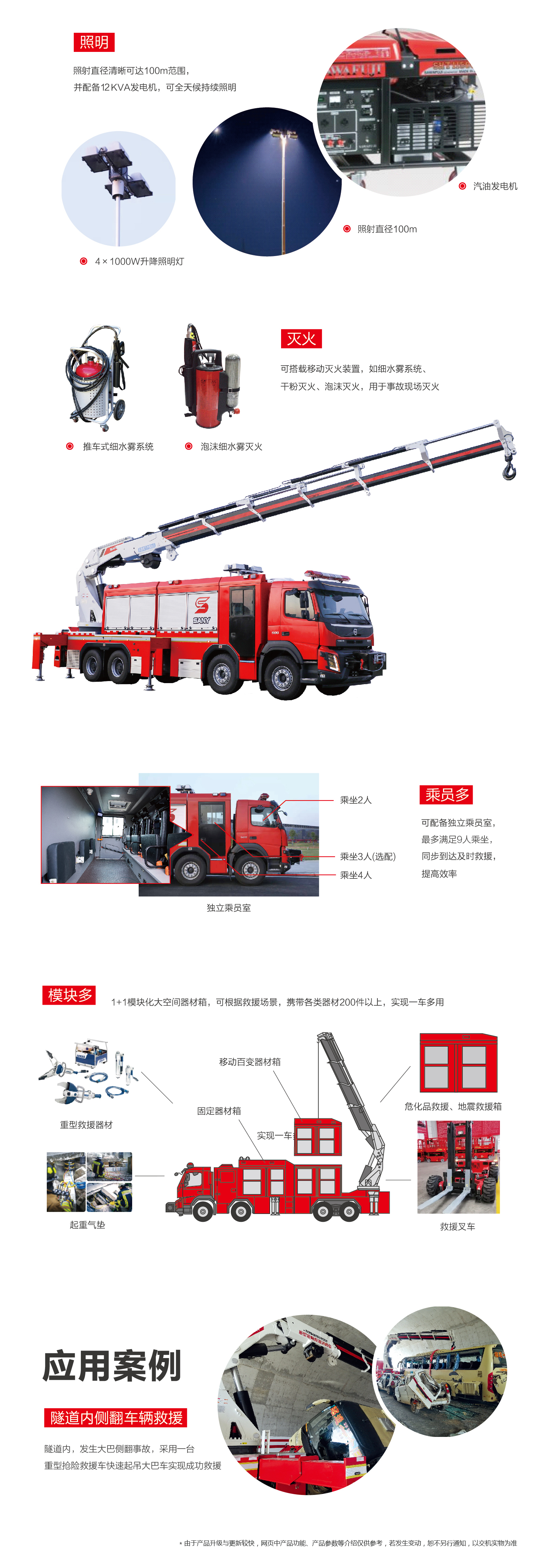 三一SQ1000重型抢险救援消防车,集重型吊重、牵引、发电、照明以及移动模块化器材箱等功能于一身的多功能重型抢险救援车。主要应用于隧道低矮空间救援、高速公路救援、桥梁事故救援等;采用移动模块化器材箱,可根据事故类型配备地震救援器材箱、水域救援器材箱、危化品救援器材箱,仅需一个底盘即可搭载不同救援器材箱,实现一车多用。