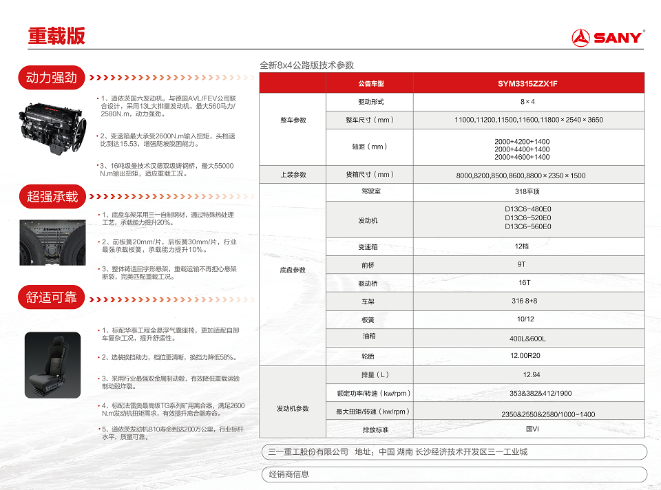 动力强劲,道依茨国六发动机,与德国AVLIFEV公司联合设计,采用13L大排量发动机,动力强劲。变速箱最大承受2600N.m输入扭矩,增强爬坡脱困能力。