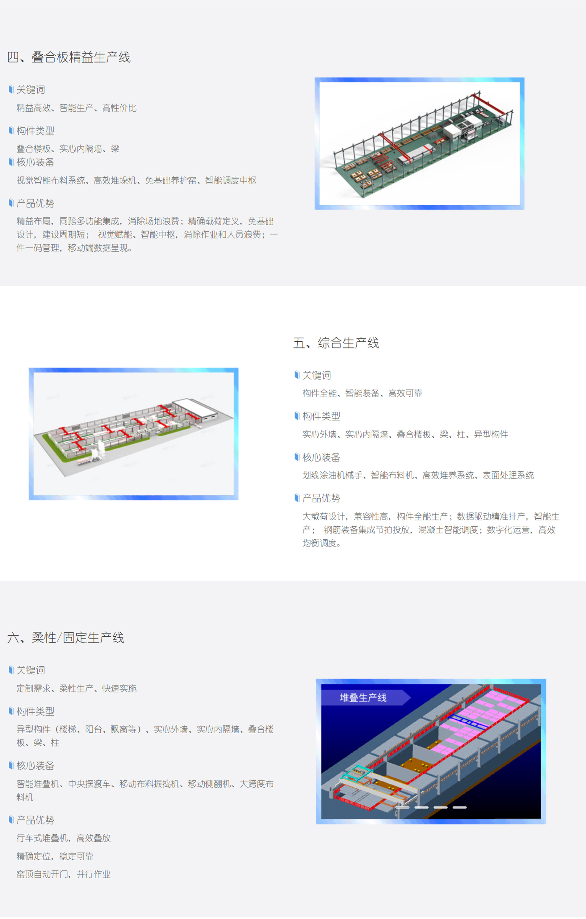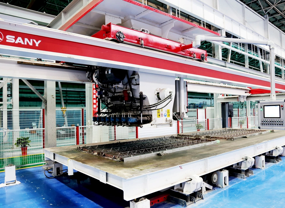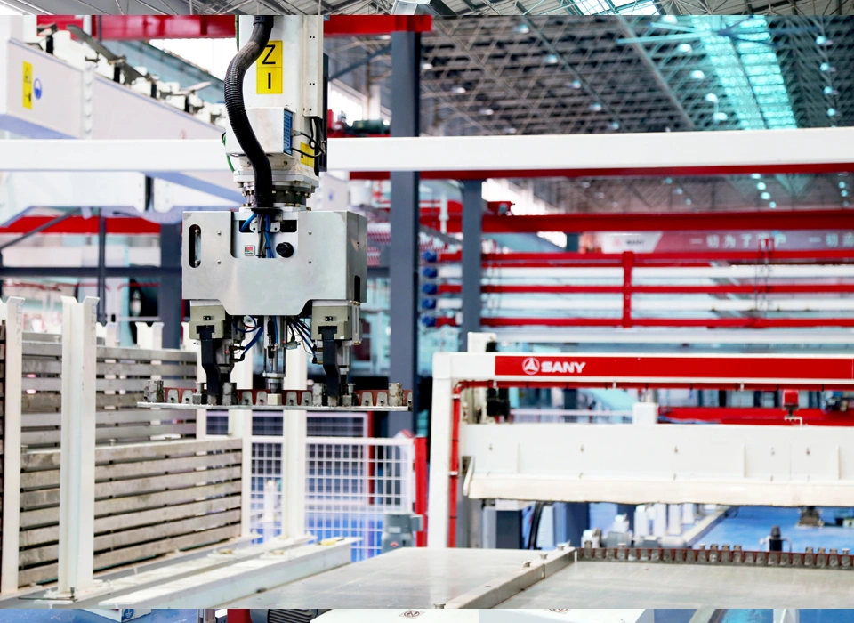 以拆布模机器人、柔性钢筋智能系统、视觉质检、智能布料振捣、混凝土调度、高精度翻转合模、高效堆养为核心的成套智能PC装备数驱自动化JIT(节拍)生产,作业人员需求降低40%。