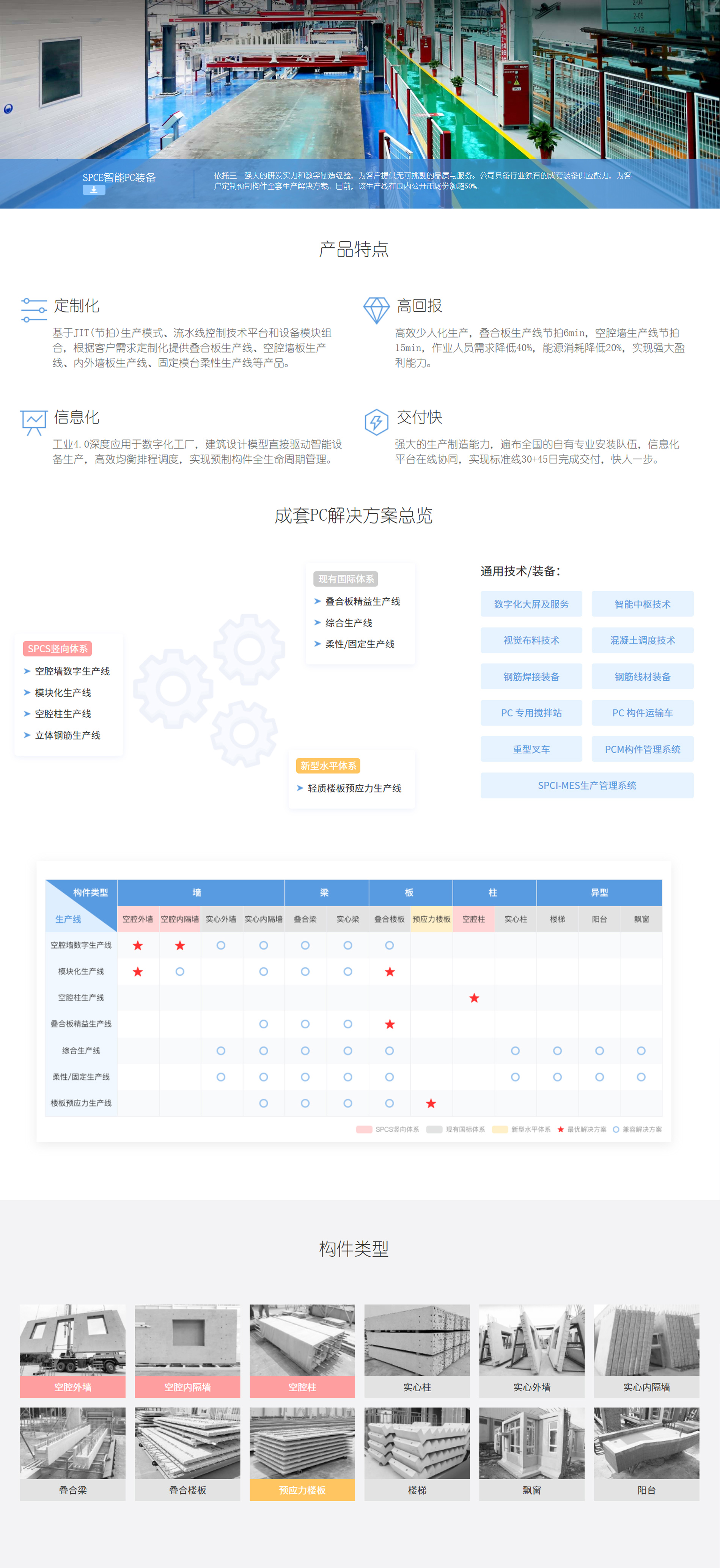 PCTEAM平台在线协同设计、生产、施工端数据。主流BIM软件实现构件高效设计拆分,SPCI工业软件直驱成套PC智能装备自动生产,PCM构件管理系统实现生产计划自动排产,构件全生命周期一件一码信息化管理。综合运营效率提升30%。